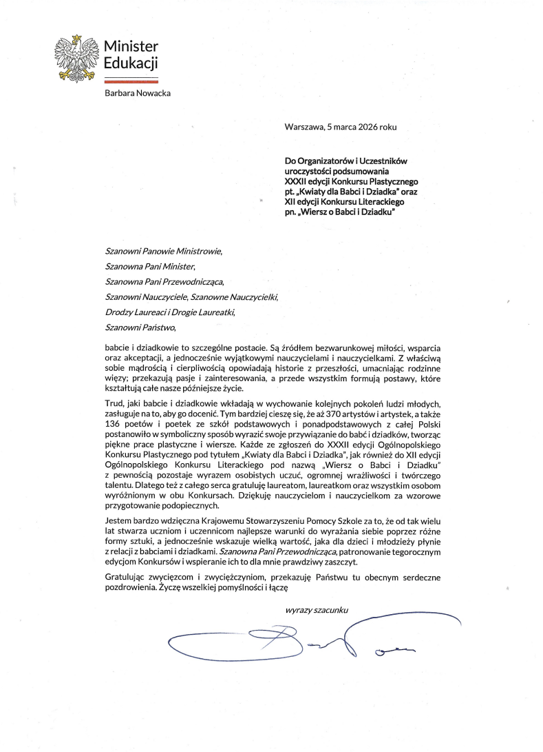 Gala Laureatów XXXII edycji Ogólnopolskiego Konkursu Plastycznego pt. „Kwiaty dla Babci i Dziadka” i XII edycji Ogólnopolskiego Konkursu Literackiego pt. „Wiersz o Babci